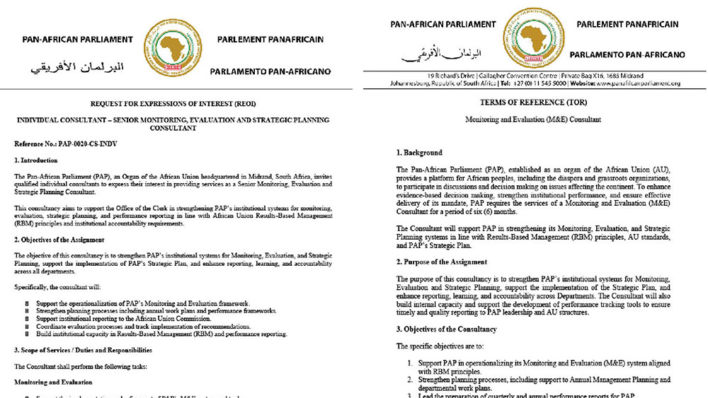 The Pan-African Parliament (PAP), an Organ of the African Union headquartered in Midrand, South Africa, invites qualified individual consultants to express their interest in providing services as a Senior Monitoring, Evaluation and Strategic Planning Consultant.